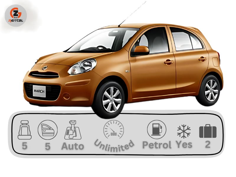 NISSAN MARCH Category: 6 Seater Transmission: Automatic (at) Passengers: 5 Luggage: 1 Body type: Hatchback Year: 2022 Fuel: Gasoline No. of doors: 5 Color: Odometer: 67756 Options: Air condition, Lane departure warning, Rearview camera TARIFS Price for 1 day 26 € short term day33.80 €/daymid term day29.12 €/daystandard day26.00 €/day SELECT DESCRIPTION
